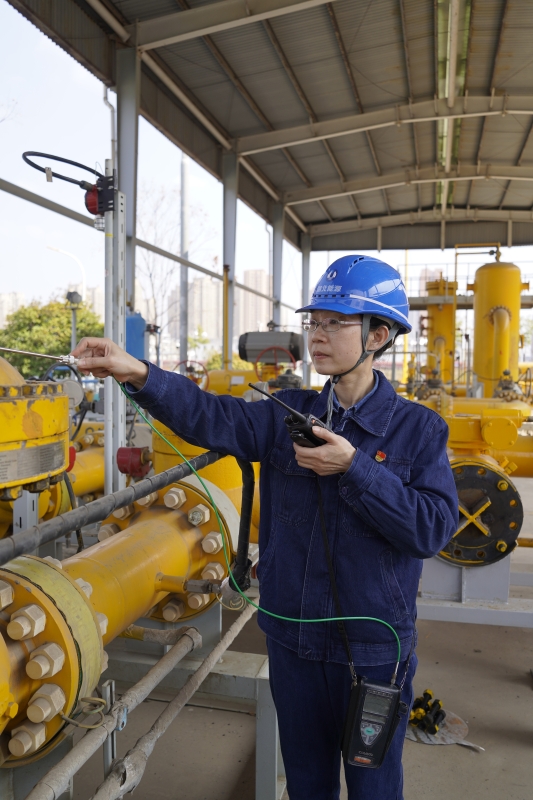 嚴群用可燃氣體檢測儀檢測天然氣是否泄漏(綜合能源公司供稿)
